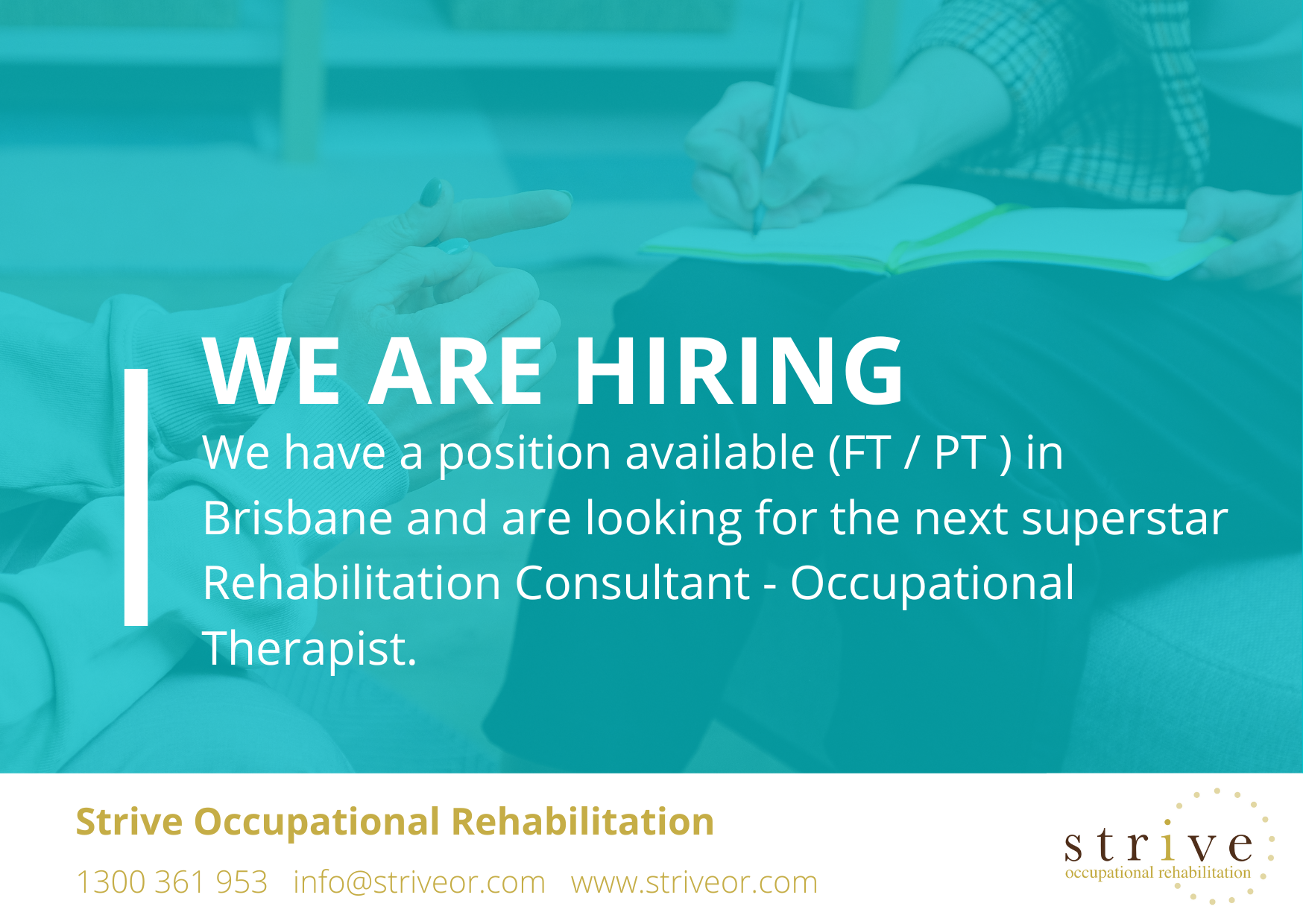Strive is an equal opportunity employer supporting a diverse and inclusive workplace. Our workplace culture is enriched by differences in ethnicity, gender, sexual orientation, gender identity, religion, age and family arrangements. We encourage applications from Aboriginal and Torres Strait Islander people.